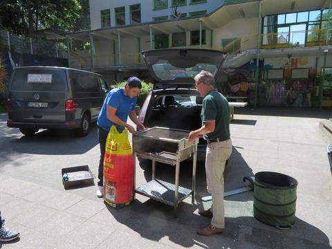 Der Grill ist da. Jetzt kann's morgen losgehen. Das Unterhaltungsprogramm auf der Bühne steht. An 12 Verkaufsständen werden tolle Sachen - von wunderschönen Perlenketten bis zu handbemalten Wanduhren - unseren Gästen zum Verkauf angeboten. Bei der Tombola sind über 150 Preise zu gewinnen. Die in dieser Woche frisch ausgebildeten Sporthelfer bieten viele sportliche Mitmachaktionen an. Unsere Ehrengäste: 2 Ponys, die den Weg zur Aretzstraße gefunden haben. Dazu Infostände und eine reichhaltige Gastronomie mit Grillspezialitäten, vielen Salaten, Quiches Lorraines sowie mit Kaffee, Kuchen,Tee und einem reichhaltigen Kuchenbüffet. Bis morgen Mittag werden die letzten Aufbauten und Proben durchgeführt und dann starten wir pünktlich um 16.00 Uhr mit der 2. Auflage unseres Schulfests "Wir feiern mit Nachbarn und Freunden".